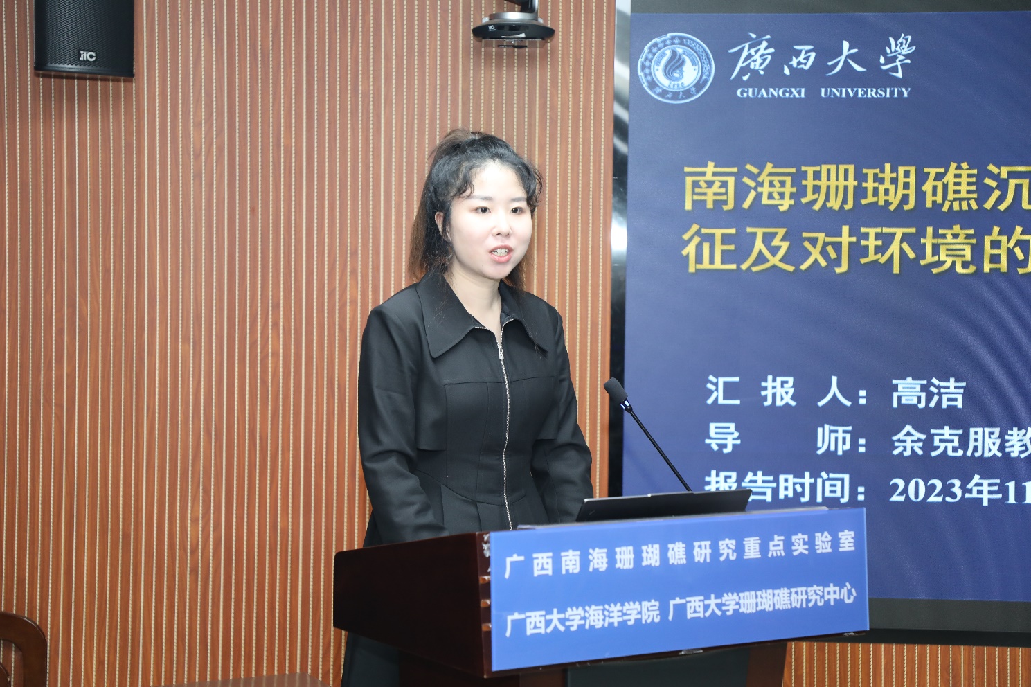 包锐教授还与我院师生进行座谈交流。余克服院长、广西南海珊瑚礁研究重点实验室常务副主任黄荣永相继介绍海洋学院、广西南海珊瑚礁研究重点实验室的综合建设情况。交流会中,海洋科学2021级硕士研究生高洁以“南海珊瑚礁区沉积物中有机碳的埋藏特征及对环境的指示意义”为题,从研究背景、拟解决的科学问题、目前初步结果等方面详细介绍了珊瑚礁沉积有机碳在碳循环中的重要作用。包锐教授结合他自己的求学和科研相关经历,为同学们分享了如何讲好科研故事、增加国际视野等宝贵经验。