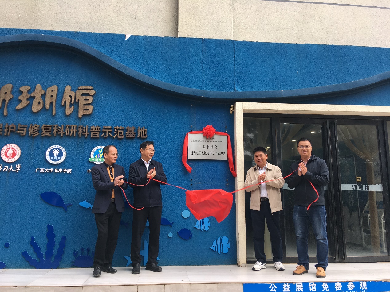 北海市海洋局海洋预警监测科杨嘉科长、广西涠洲岛珊瑚礁国家级海洋公园管理站站长周于娜、刘晓薇,涠洲岛旅游区管委会建设开发管理局局长罗继志,海洋学院涠洲岛珊瑚馆馆长黄雯、常务副馆长黄爱国,海洋学院潜水与海洋科考中心主任黄学勇等一同参加揭牌仪式。(黄爱国/文 李雨萧/图 周剑/编辑 余克服/审核)