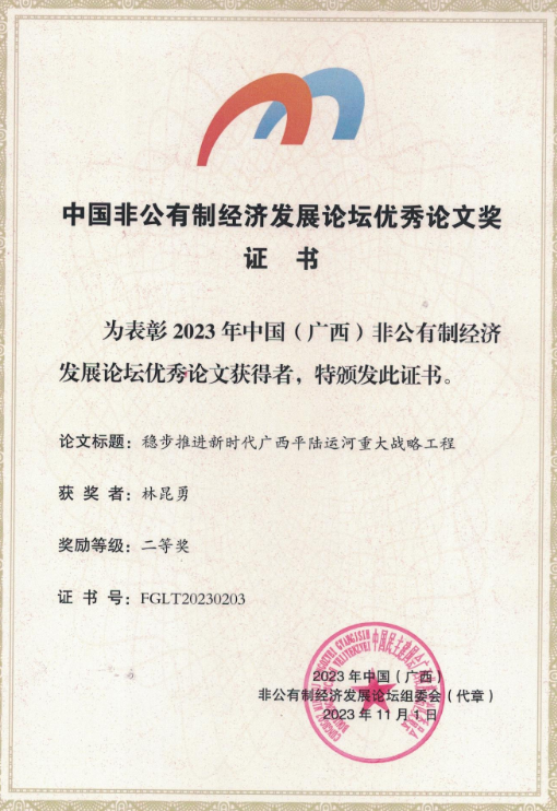 近日,中国民主建国会广西壮族自治区委员会公布了2023年中国(广西)非公有制经济发展论坛获奖论文名单,我院教师林昆勇副教授撰写的《稳步推进新时代广西平陆运河重大战略工程》研究论文荣获二等奖。
