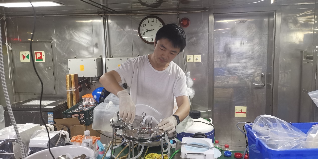 2023年西太平洋基金委共享航次表层海水过滤作业(图中为俞小鹏博士)