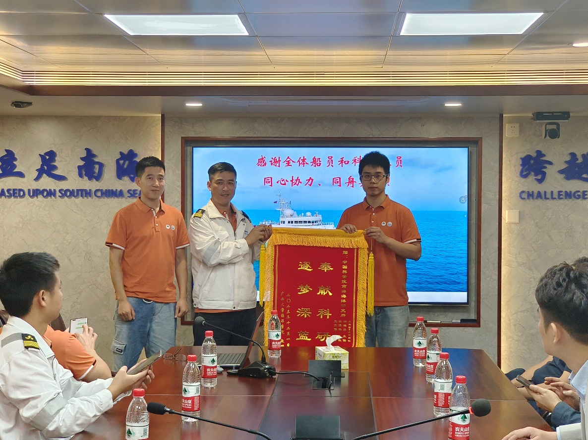 “蓝色梦想”科考队员向中国科学院南海海洋研究所及“实验6”科考船全体队员赠送锦旗