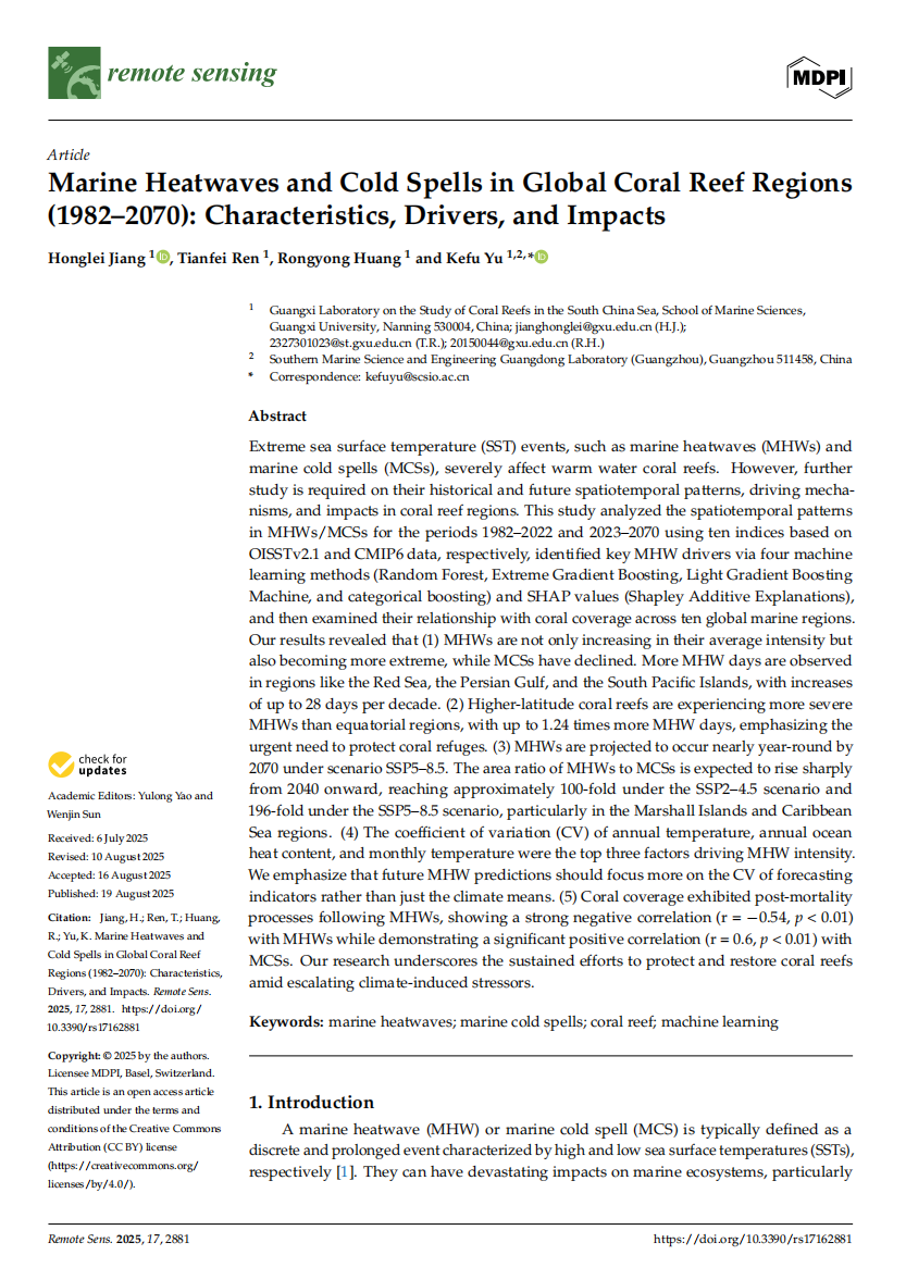 Jiang Honglei , Ren Tianfei , Huang Rongyong, Yu Kefu*. Marine Heatwaves and Cold Spells in Global Coral Reef Regions (1982–2070): Characteristics, Drivers, and Impacts. Remote Sensing. 2025, 17, 2881. https://doi.org/10.3390/rs17162881